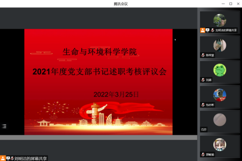2022年3月25日下午14时,金年会体育在线登录生命与环境科学学院在线上召开了2021年度党支部书记述职考核评议会。生命与环境科学学院党委书记张严同志、党委副书记、院长周宜君同志、党委副书记、纪委书记王叶红同志、组织员李晓华同志、党委委员郭泺同志、刘越同志、任华堂同志、石莎同志及全体党支部书记出席了会议,本次述职评议考核大会由学院党委副书记王叶红同志主持。